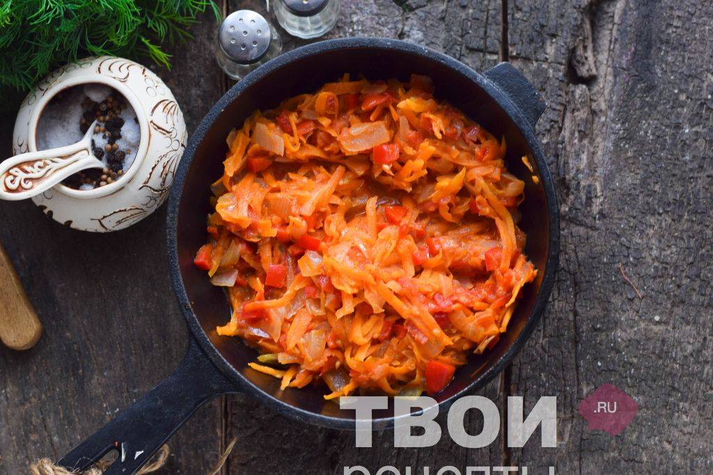 - Измельченный лучок и морковь перемещаются на сковороду с разогретым по максимуму маслом и прожариваются, после чего присоединяются к томату.