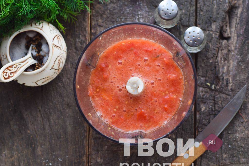 - Очищенные от кожицы помидоры необходимо превратить в пюре, измельчив их в блендере или пропустив через мясорубку.