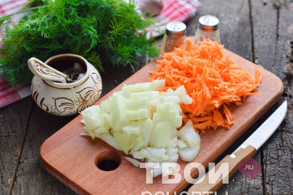 Промыть и очистить морковь, натереть. Лук нарезать полукольцами.
