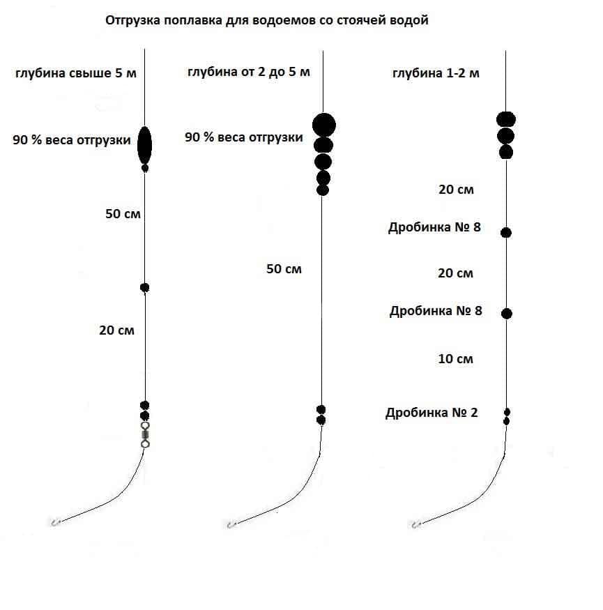 - Маховая удочка. Основная огрузка — крепится в 20 сантиметрах над промежуточным грузом. Составляет 60% от всего веса груза. Промежуточный груз — используется одна дробина, крепится на 15 сантиметрах от подпаска. Подпасок — небольшое количество дробинок, крепится у петли поводка и лески. Вес — 0,2 грамма
