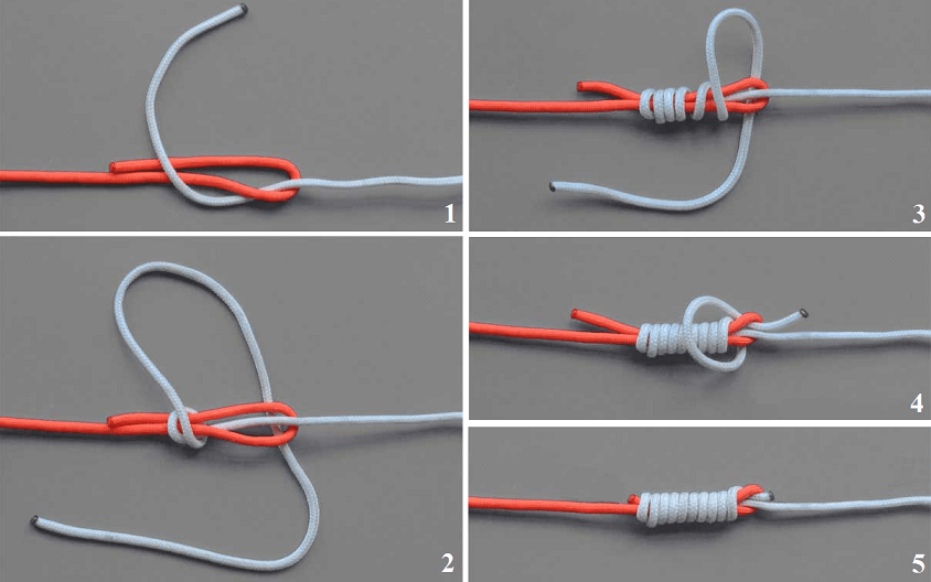 Чтобы получить идеальный Кровавый узел нужно обвернуть одну леску вокруг другой, проделать несколько оборотов и продеть через середину. Если за основу берется плетенка, то лучше сделать 10 оборотов, леской достаточно будет и 7. Смачиваем, затягиваем и узел готов.