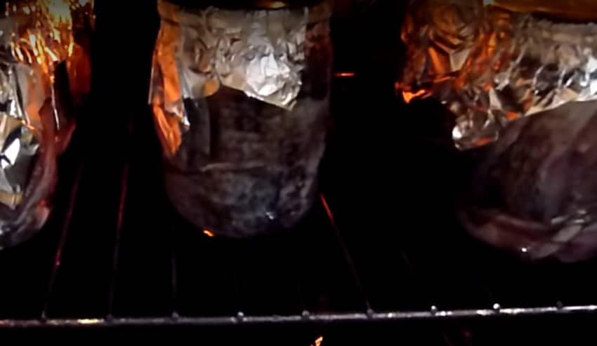 Я обычно ставлю банки в духовку, а уже затем её включаю и довожу до температуры 250 градусов. Так жидкость в банках закипает быстрее, и затем сбрасываю температуру до 150 градусов. Как только банки закипают, засекаем время и занимаемся делами, иногда поглядывая в духовку чтобы удостовериться, что всё кипит и бурлит. За 10 минут до готовности, в нашем случае 2 часа, стерилизуем крышки. Кипятим их около 10 минут. Два часа прошло, выключаем духовку и даем банкам постоять минут пять, чтобы они немного охладились. Если сразу же закрутить банку крышкой может произойти бух-х, или даже ба-бах. Вынимаем банки их духовки и закручиваем ещё горячими крышками. Всё.