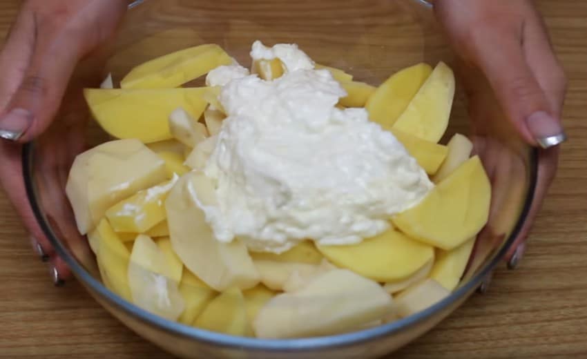 3. Дольки картофеля выложите в глубокую миску. Добавьте майонезно-чесночный соус и хорошенько распределите по каждой дольке.