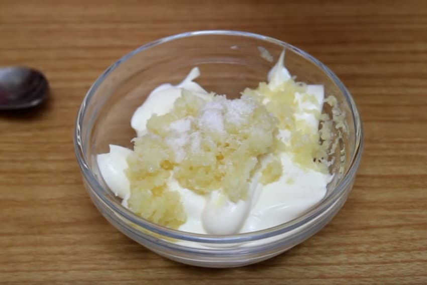 2. В небольшой миске смешайте майонез с измельченным чесноком через чеснокодавку. Добавьте соль и специи по желанию.