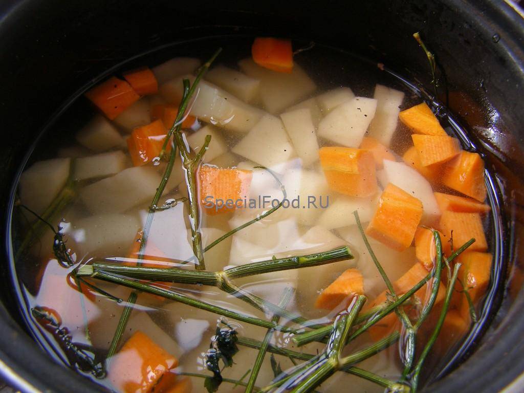 . В процеженный бульон закладываем сначала картофель, а через 10 минут обжарку.