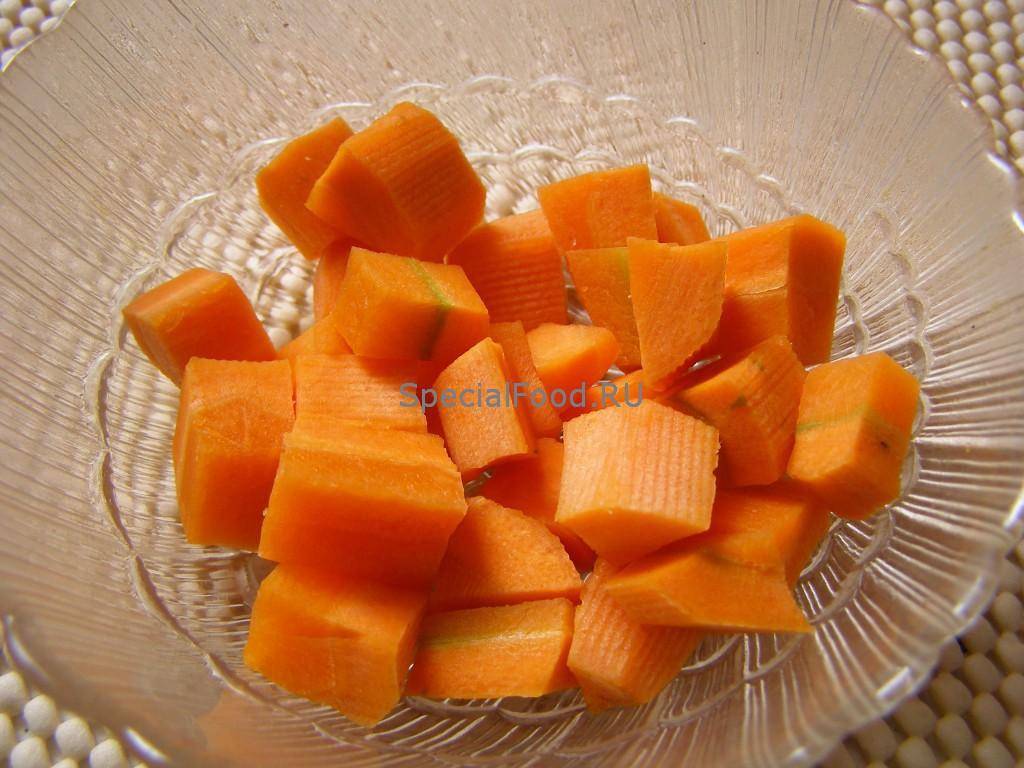 3. Овощи очистить. Лук порезать мелкими кубиками, морковь средними, а картофель крупными кубками.