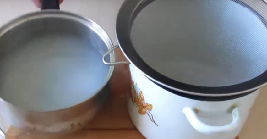 Бульон осторожно процеживается через марлю. Ставится на огонь.