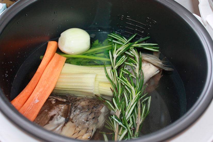 - Разрезать на 4 куска морковку. Залить водой. Добавить лаврушку, щучьи хвосты и головы, а также разрезанную пополам луковицу. С лука можно не срезать шелуху, в этом случае бульон получится красивого золотистого оттенка.