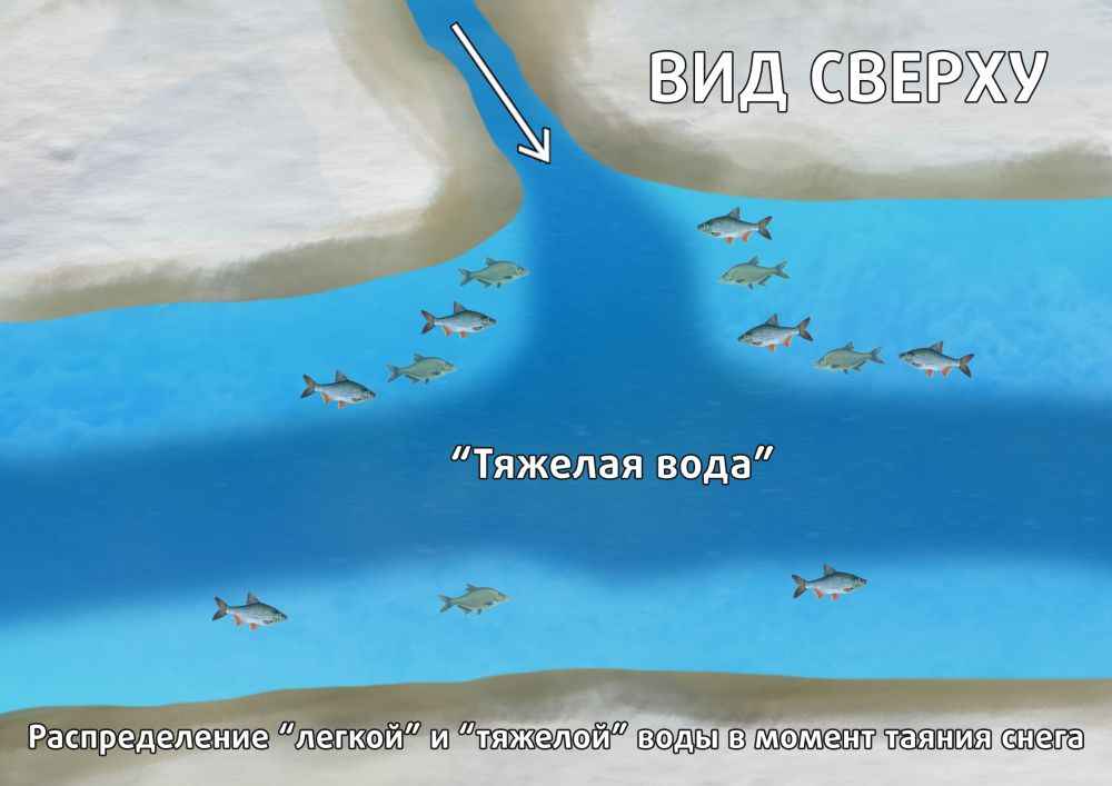 Талая вода холодная, её температура составляет около нуля. Лещ, густера и синец сторонятся такой воды — и предпочитают отстаиваться по границам холодных течений (рис. 2), либо продолжают оставаться «на зимних квартирах», совершая периодические прогулки вверх-вниз.