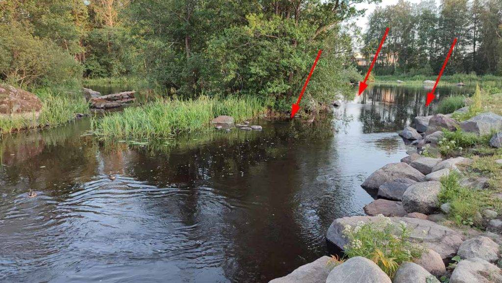 Особенно нужно уделить внимание местам сразу за водными растениями, участкам со спокойным ровным течением.Если в воде есть затопленные коряги, деревья, они могут служить рыбе укрытием, деревья и ветки над водой так же не должны остаться без внимания рыболова. С таких веток и деревьев обычно падает корм для рыбы