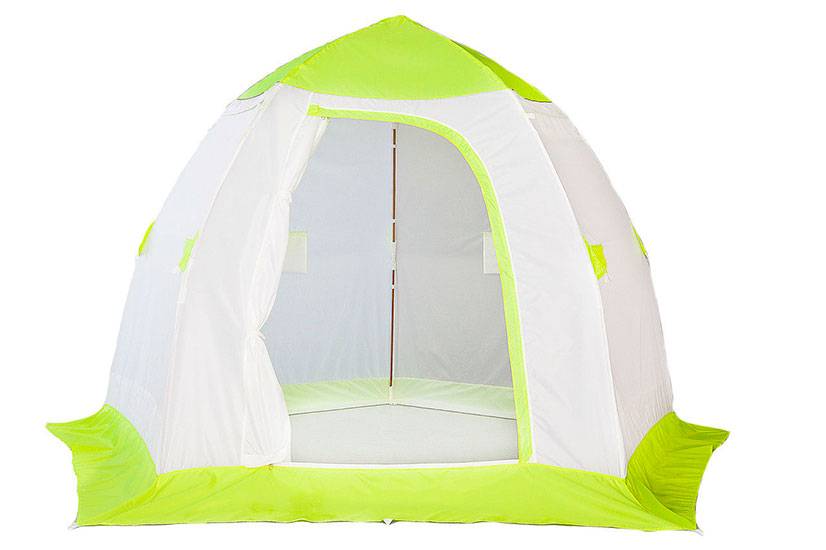 Подобная палатка многими признается лучшей по комфортности. Она производится в России, цена – 22000 рублей. Конструкция имеет многогранную форму, легко собирается, обладает прочным креплением и стойкостью под действием ветра, что обеспечивается за счет колышков и штормовых растяжек.