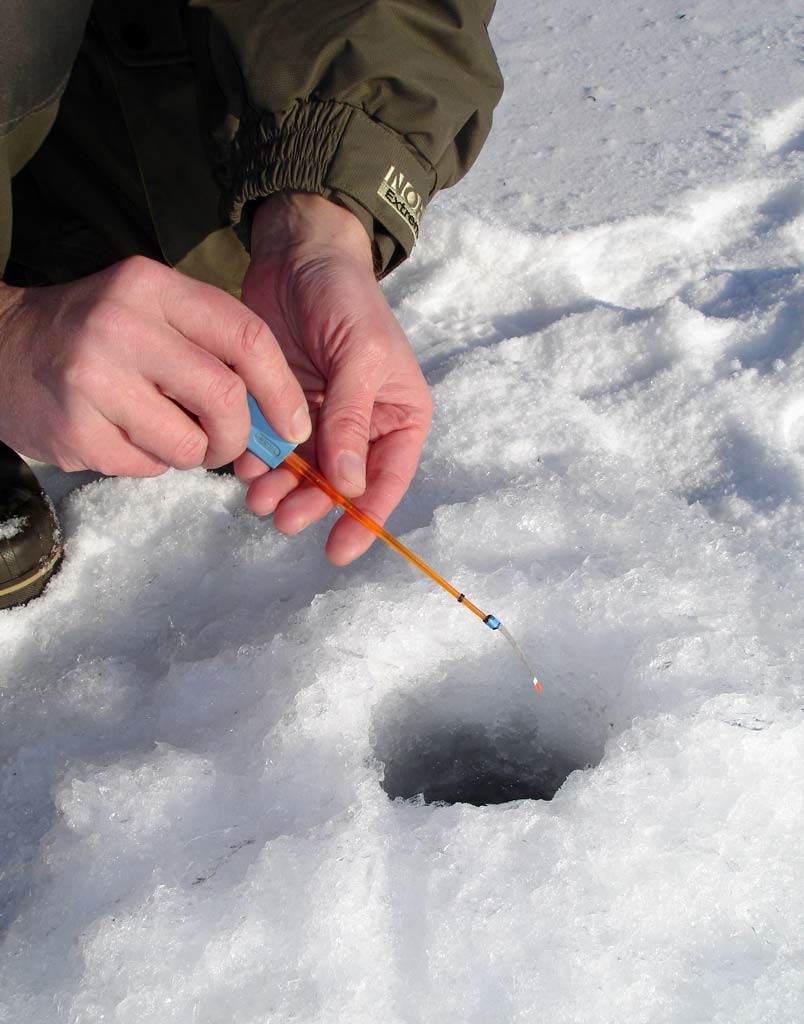 Удильник во всех случаях располагаю под углом 45 градусов к лунке – это стандартная позиция. Меняя этот угол от 45 до 90 градусов (то есть хлыстик смотрит в лунку уже вертикально), можно при одной и той же игре удильником менять амплитуду движений мормышки. При домашних испытаниях мормышки в банке с водой это отлично наблюдается.